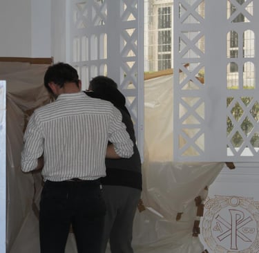 Le bloc à été posé le 23 décembre 2025. Il a fallu tout d'abord créer un espace suffisant dans le mur de la chapelle, puis placer la queue du bloc en tiroir. Enfin, nous avons fait la maçonnerie du mur en scellant définitivement le bloc.